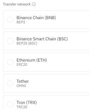 例如,如果转至币安USDT提现页面,可以看到五种不同的转账网络选项:币安链(BEP2)、币安智能链(BEP20)、以太坊(ERC20)、泰达币(OMNI)和Tron (TRC20)。