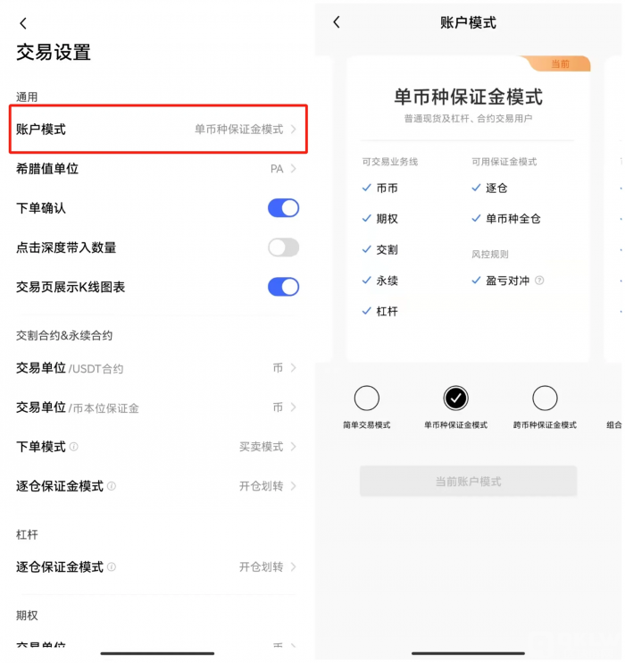 2)受众单币种保证金模式:适合有交易经验的散户和量化用户选择,用户可在统一账户模式下点击“交易设置”按钮→设置账户模式→选择单币种保证金模式,完成之后答题即可激活。