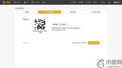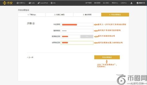 最后进入开启谷歌验证页面,用户需填写上一步中记录下来的16位密钥、币安账号登录密码,手机短信验证码,谷歌验证器上面的验证码,点击“开启谷歌验证”完成验证程序。