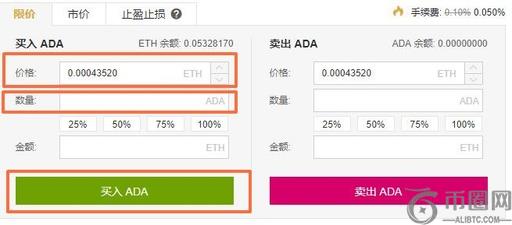用户进入交易中心的下单区域,参考区域③、④买卖区价格,输入合适的ADA购买价、输入数量,点击买入ADA,完成购买。(卖单同理)