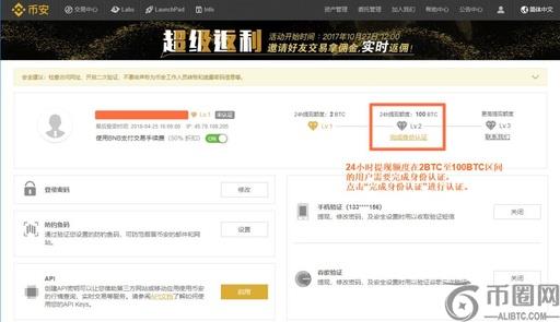 24小时提现额度在2BTC至100BTC区间的用户需要完成身份认证,点击“完成身份认证”进行认证。