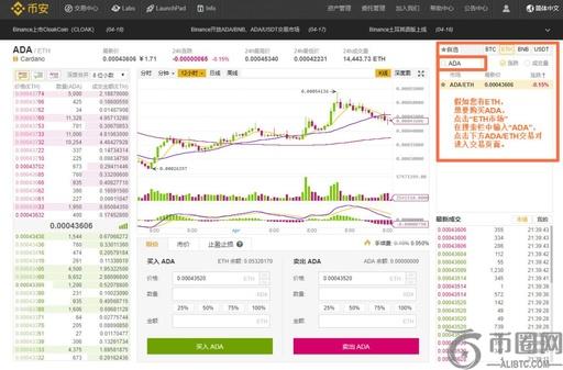 假如您有ETH,想要购买ADA,点击“ETH市场”在搜索栏中输入“ADA”,点击下方ADA/ETH交易对进入交易页面。